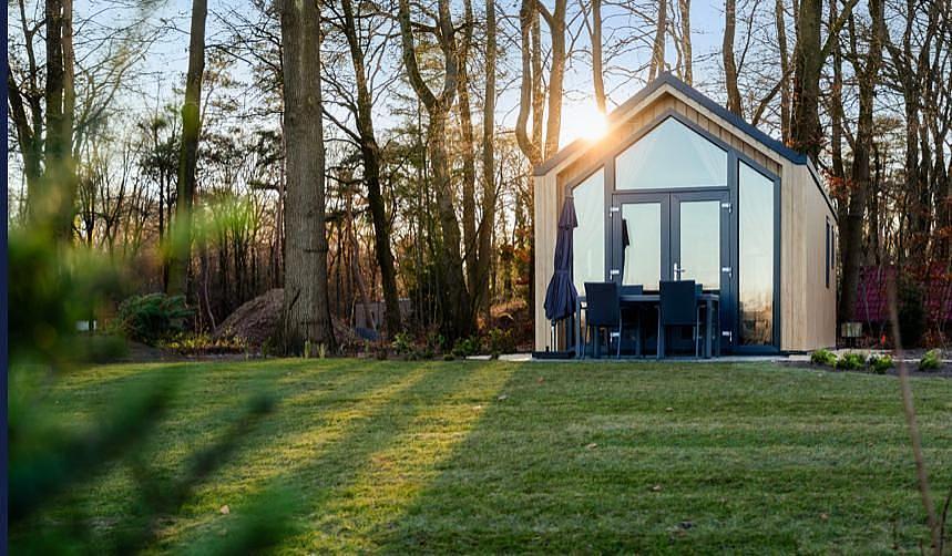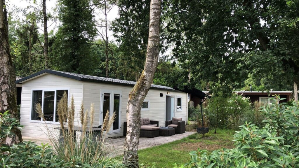 Nathalie bekijkt een van onze prachtige chalets, vertelt wat over de omgeving en maakt een wandeling door het bos.